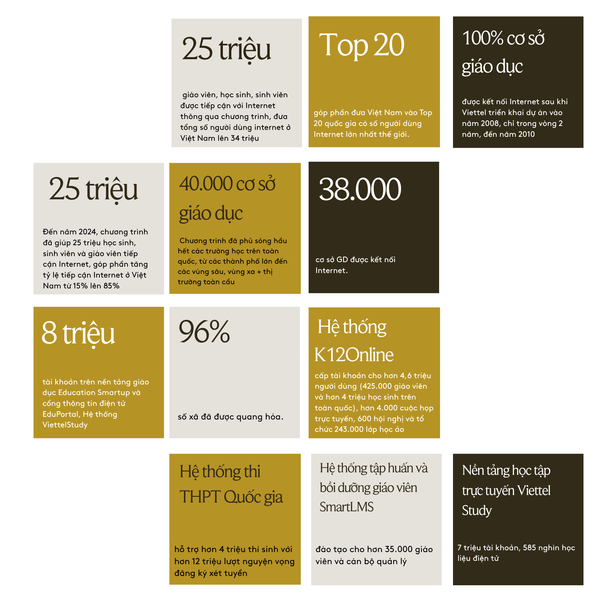 - Thu hẹp khoảng cách số: Giúp các trường học, đặc biệt là các trường ở vùng sâu, vùng xa tiếp cận với công nghệ và thông tin hiện đại. Tính đến đầu năm học 2008–2009, vẫn còn khoảng hơn 17.000 trên tổng số 27.500 trường học trên toàn quốc chưa nối Internet, chiếm đến 62% tổng số trường học. Sau khi Viettel triển khai dự án vào năm 2008, chỉ trong vòng 2 năm, đến năm 2010, Việt Nam đã trở thành một trong số ít quốc gia trên thế giới có 100% cơ sở giáo dục được kết nối Internet. Đến năm 2024, chương trình đã giúp 25 triệu học sinh, sinh viên và giáo viên tiếp cận Internet, góp phần tăng tỷ lệ tiếp cận Internet ở Việt Nam từ 15% lên 85%