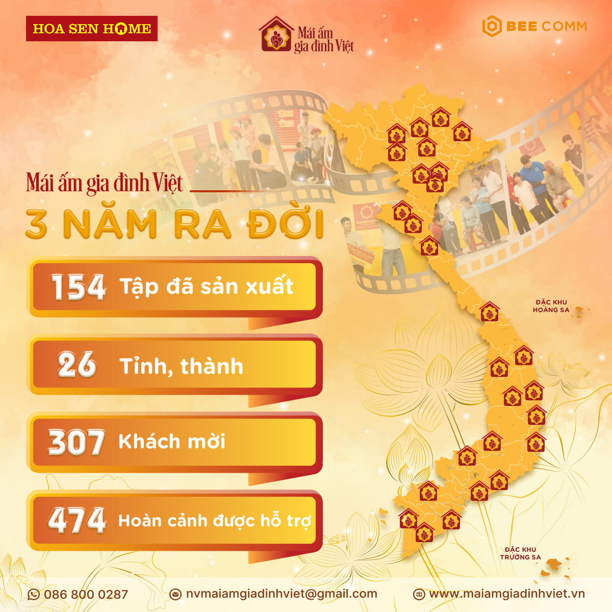 - Chương trình Mái ấm gia đình Việt ra mắt từ năm 2022 đến nay, sau hơn ba năm phiên bản truyền hình thực tế ra đời, đi qua 26/34 tỉnh thành, tìm đến và đồng hành cùng những mảnh đời thực sự cần được sẻ chia, trao đi gần 52 tỷ đồng để tiếp sức cho gần 500 gia đình vượt qua nghịch cảnh, nâng bước hơn 1000 em nhỏ được tiếp tục đến trường.