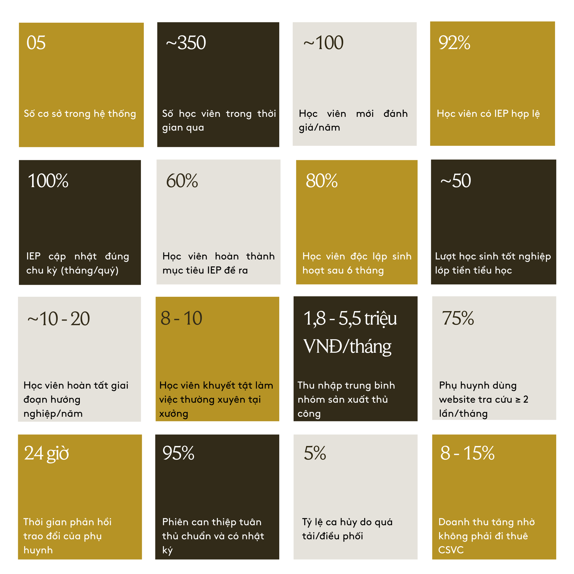 Nói chung, dự án mang lại giá trị cốt lõi cho người thụ hưởng: phẩm giá, năng lực, quyền hưởng công bằng và vị thế xã hội. Từ các nhóm học đến công việc, từ kỹ năng đến thu nhập, các học viên và gia đình có con đường rõ ràng để đi tiếp - một con đường không dừng ở “can thiệp”, mà kết thúc bằng trao quyền sống độc lập và ý nghĩa được học tập, lao động hạnh phúc suốt đời.