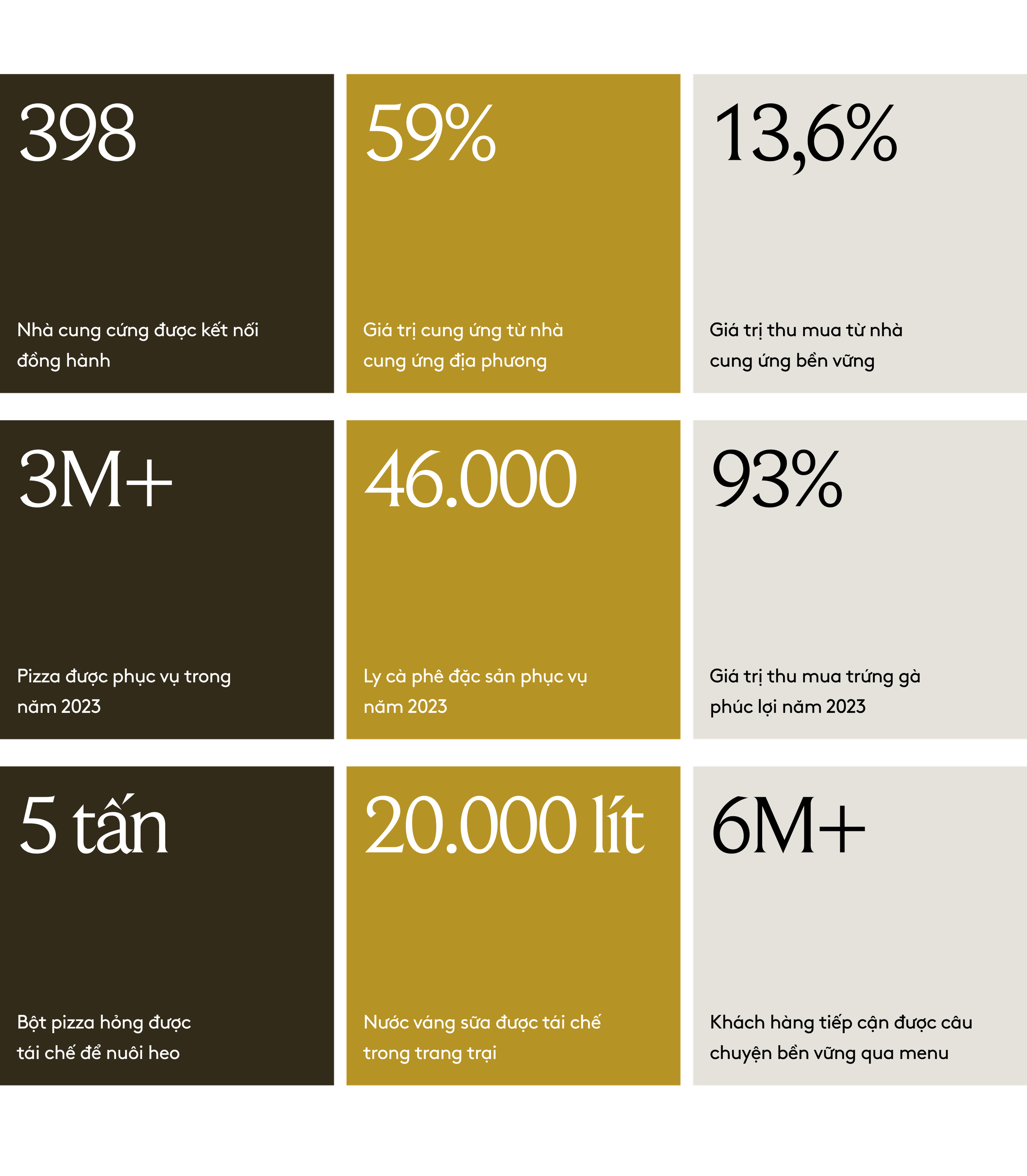 - Cung cấp sản phẩm chất lượng cao: Hơn 3 triệu chiếc pizza và 46.000 ly cà phê đặc sản được phục vụ vào năm 2023, cùng với tỷ lệ thu mua trứng gà phúc lợi đạt 93% vào cuối năm, mang đến cho khách hàng trải nghiệm ẩm thực vừa chất lượng vừa đảm bảo các tiêu chuẩn bền vững và phúc lợi động vật.