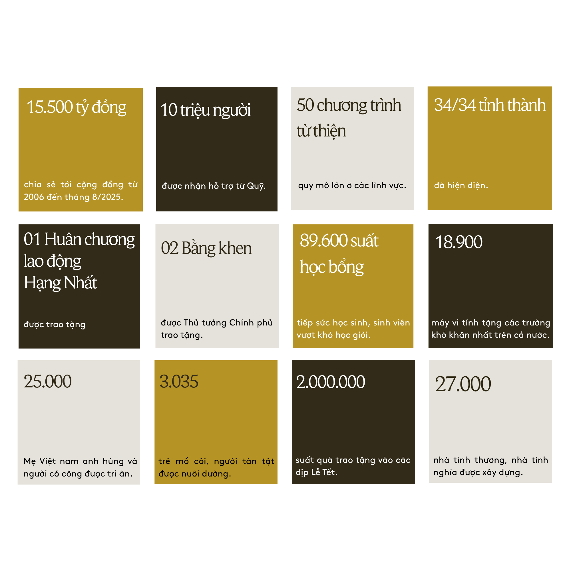 Tính đến tháng 8 năm 2025, tổng số tiền từ thiện mà Quỹ chia sẻ với cộng đồng đã lên tới hơn 15.500 tỷ đồng, duy trì sự có mặt ở tất cả 34/34 tỉnh/thành trong cả nước với trên 50 chương trình từ thiện nhân đạo được triển khai, hàng triệu người Việt Nam đã và đang được hưởng sự hỗ trợ của Quỹ. Những con số truyền cảm hứng được thể hiện rõ nét qua các hoạt động: