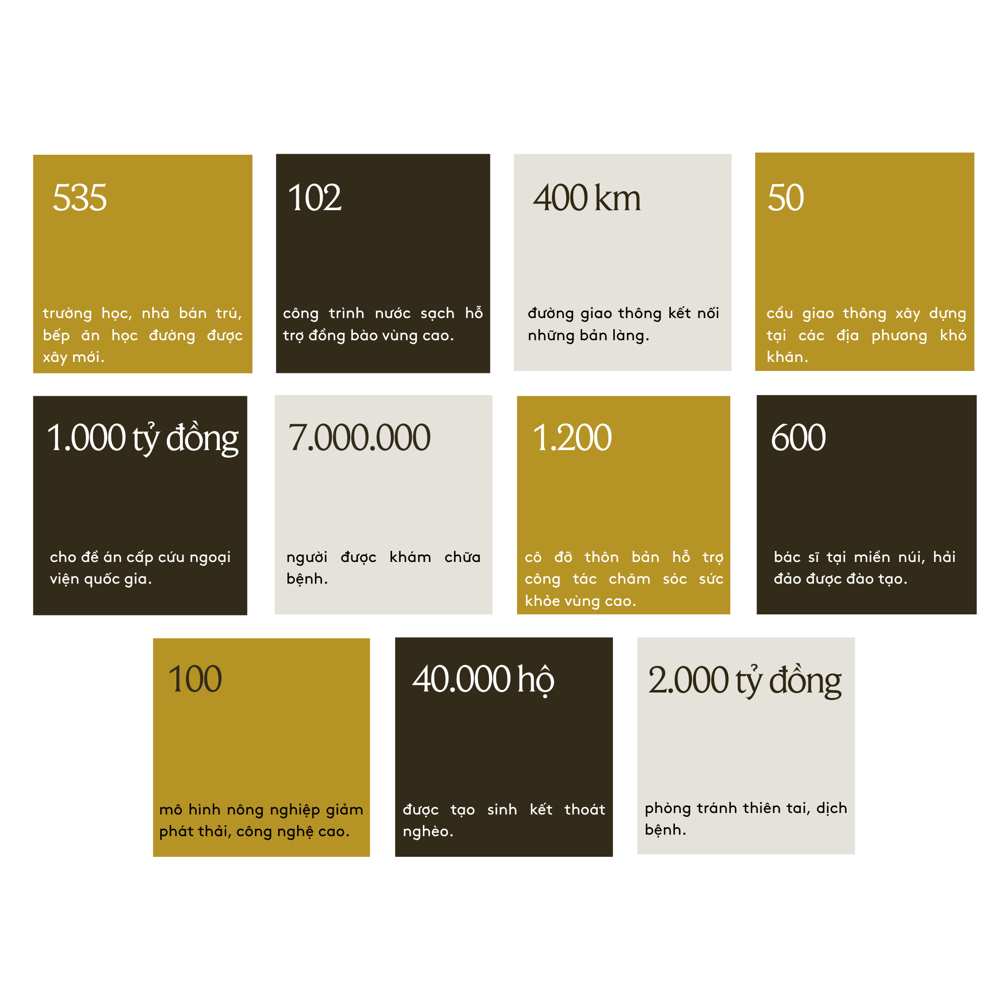 - Trong lĩnh vực xây dựng công trình dân sinh: Quỹ tài trợ xây dựng hơn 400 kilômet đường và đèn điện chiếu sáng nông thôn, 50 cầu dân sinh nhằm góp phần thay đổi rõ rệt về diện mạo vùng khăn. Triển khai và hoàn tất lắp đặt 102 công trình cấp nước sạch tại các địa phương vùng sâu, vùng xa, nơi đang đối mặt với tình trạng thiếu nước nghiêm trọng.