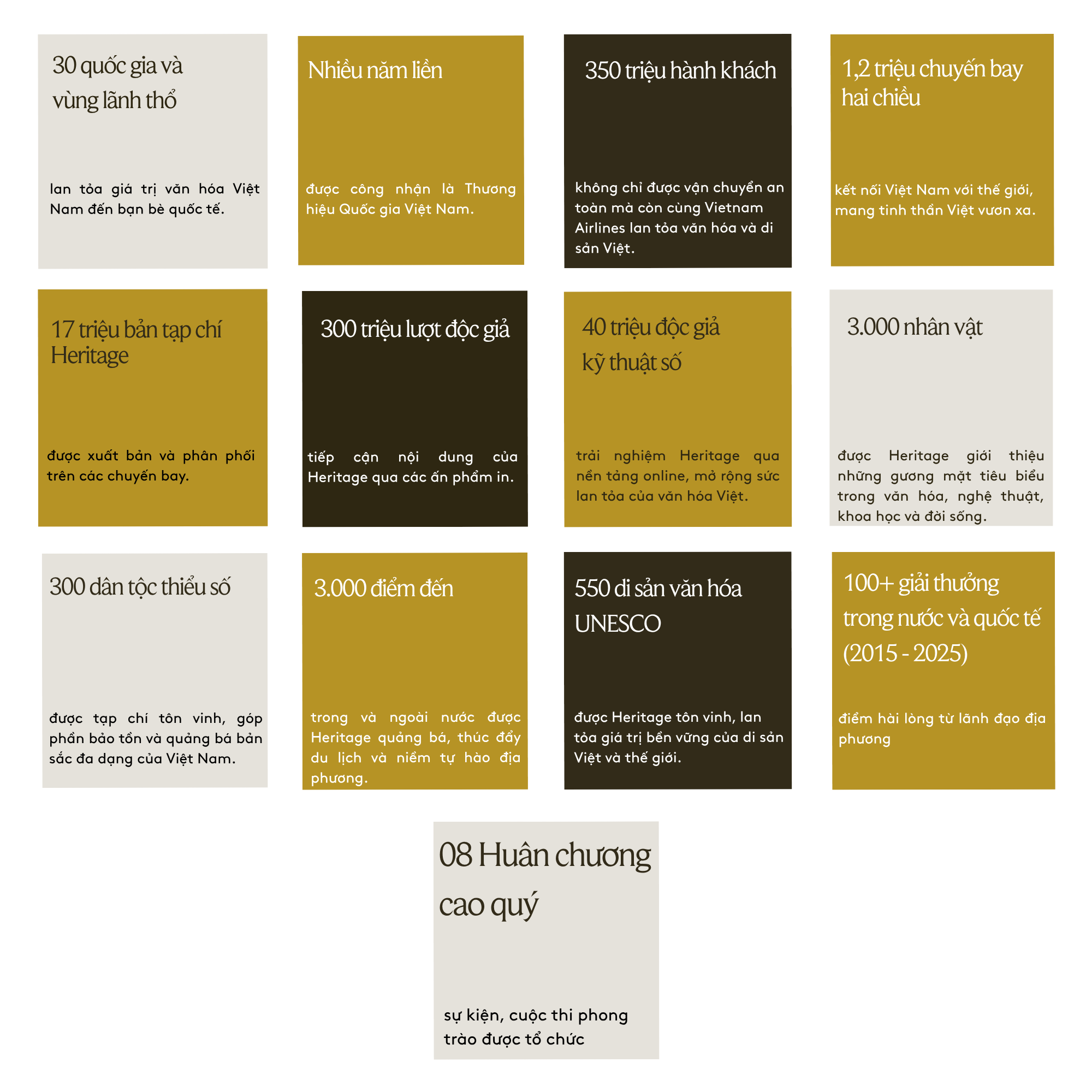 Tạp chí Heritage đạt hơn 12 triệu lượt tiếp cận mỗi năm, sản xuất hàng trăm bài viết và video song ngữ về văn hóa, con người và di sản Việt Nam. Ấn phẩm đã vinh dự nhận 05 Giải thưởng “Thông tin đối ngoại toàn quốc” do Ban Chỉ đạo Công tác Thông tin đối ngoại Trung ương, Ban Tuyên giáo Trung ương và Đài Truyền hình Việt Nam trao tặng, với các tác phẩm tiêu biểu như phim Landing - “Việt Nam, không những… mà còn…” và phim an toàn bay “Âm vang đồng điệu”.